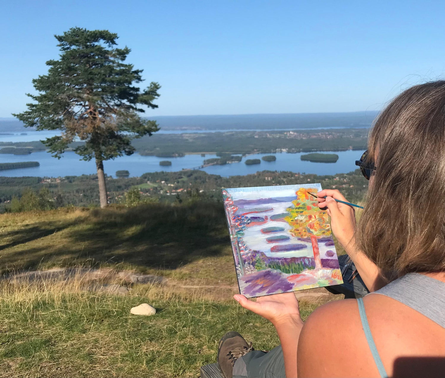 "Hanna är friluftsmålare och gör alltid skisser på plats hon tar med bilderna hem för att arbeta i en större skala då hon vill behålla ljus, färg o känslan av frihet och rymd.