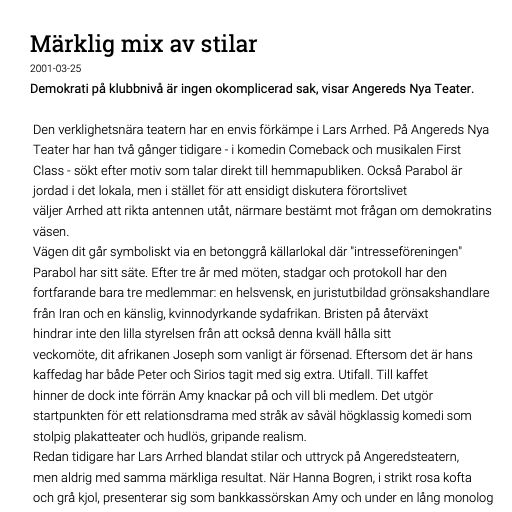 Artikel i GP, "Märklig mix av stilar", med omnämnande om Scenografin som jag gjorde som examensarbete på HDK till en pjäs på Angereds Nya teater.